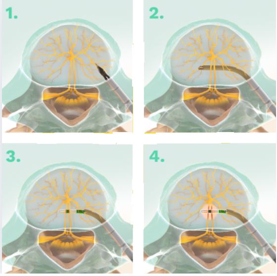Dr. Abraham inserts the radiofrequency probe into the curved path and positions it at the trunk of the basivertebral nerve.Step Four: Ablate the BVN